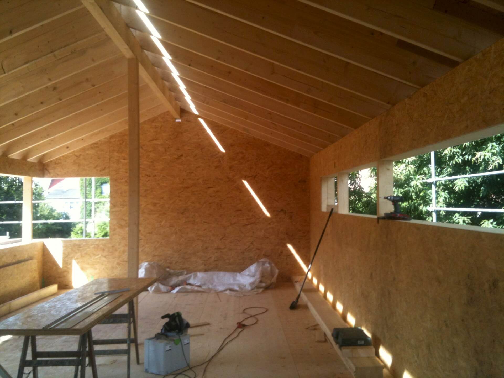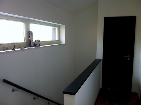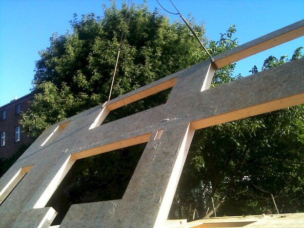 Das Haus ist ein Neubau in Holzbauweise; die Verwendung von Holz als nachwachsendem Rohstoff mit seiner langen Tradition findet hier Verwendung auf der Höhe der Zeit: als hochwärmegedämmtes Ständerwerk bietet das Haus energieeffizienten Wohnkomfort. Das Holz prägt auch die Inneren die Gestaltung mit: so lässt der Blick auf die Unterseite der Geschossdecke ihre Konstruktion aus Leimbindern erkennen, und der Holzbelag des Fußbodens setzt sich über die Treppe bis zum Obergeschoss fort. Das sichtbar belassene Holz trägt sodurch seine ästhetische Qualität zu der behaglichen Wohnatmosphäre des Hauses bei.